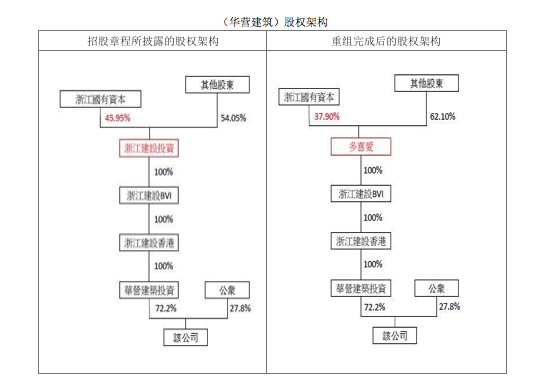 在招股章程刊发前,浙江国有资本于2019年4月与包括多喜爱集团股份有限公司(多喜爱)及其他浙江建设投资的股东在内的各方订立协议,目的是将浙江建设投资证券化及上市(该重组)。该重组涉及浙江建设投资将其所有资产及负债(包括其透过浙江建设BVI、浙江建设香港及华营建筑投资持有的华营建筑股权)注入多喜爱(多喜爱为一间在深圳证券交易所上市的公司),而多喜爱将据此向浙江建设投资的股东发行股份。在重组完成后,预期多喜爱将取代浙江建设投资成为华营建筑的控股股东之一,而浙江建设投资将被注销及随之不再成为法律实体。2019年12月,中国证券监督管理委员会(中证监)正式批准了该重组。